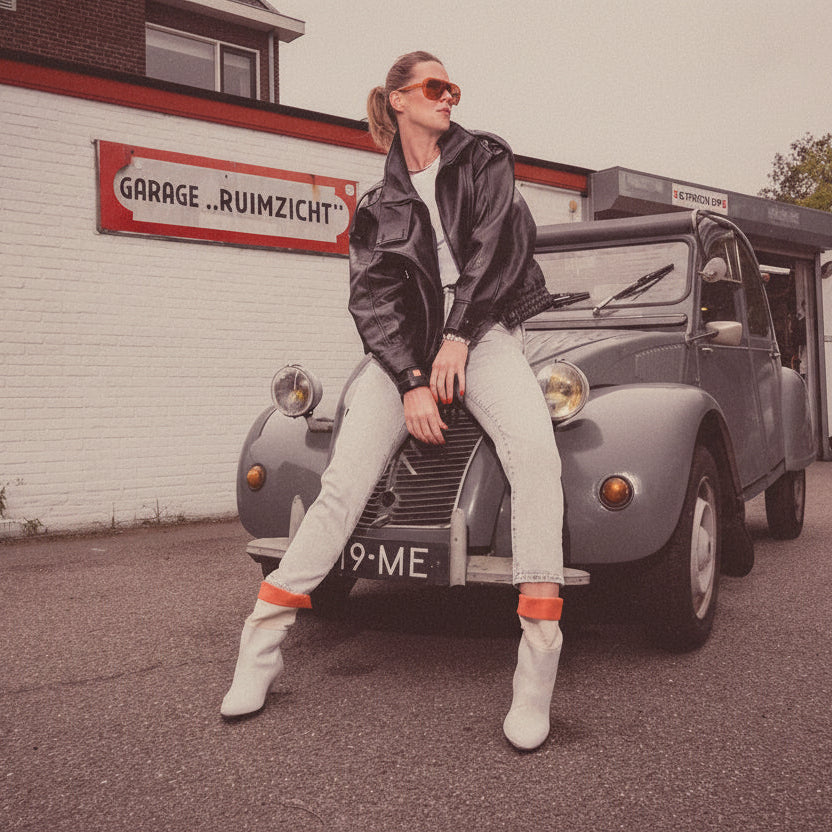 A fusion of elegance and sustainability, crafted from leftover leather in white and nude tones. Its standout vibrant coral shaft folds outward for versatility. Elevate your style with its innovative design and intricate red stitching, embracing responsible fashion while making a bold statement.